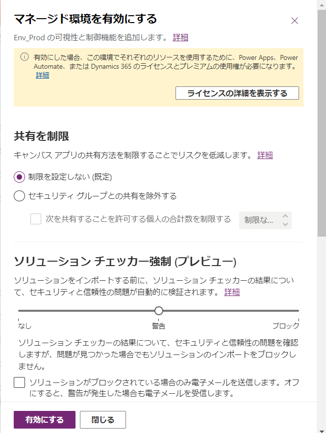 Power Platformの管理センター→環境(Env_Dev・Env_Prod)を選択 →マネージド環境を有効にするを選択