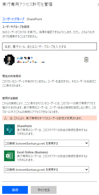 Power Automateの設定画面にて、所有者ではなく実行のみのユーザーにて共有します。
