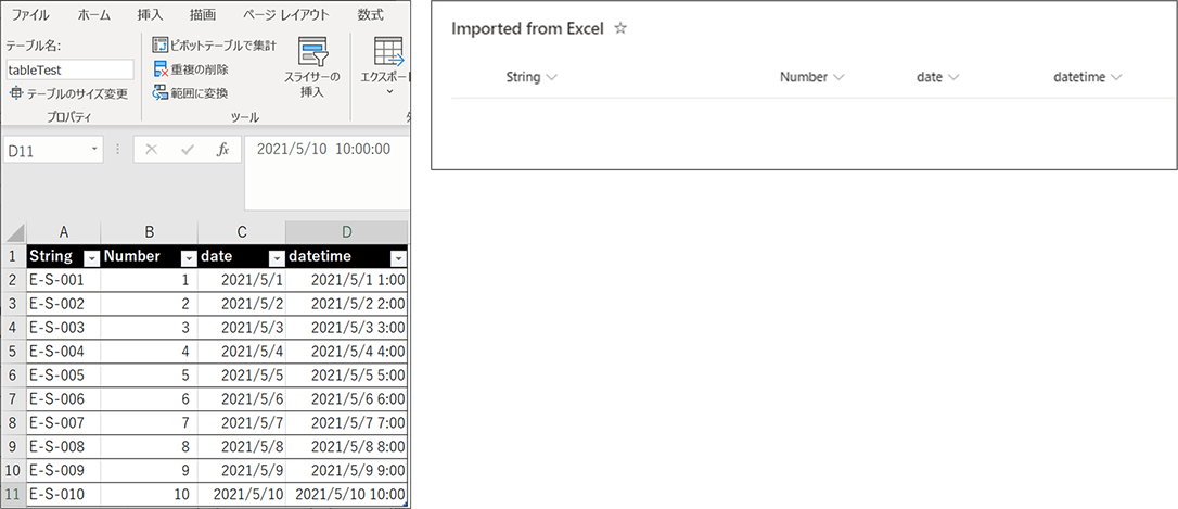 内容を確認すると、SharePointリストとExcelデータのDate列の形式が異なるため発生しているようです。
