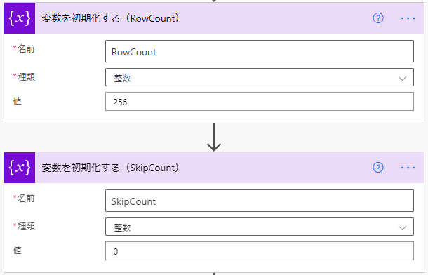 変数を初期化するアクションでRowCount、SkipCountの初期値を設定してください。