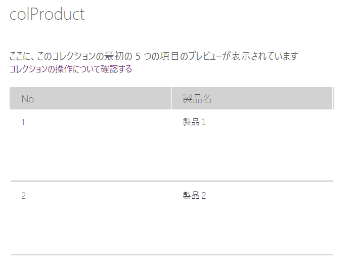 Collect(colProduct,{ No: 1, 製品名: txtProduct.Text}); // No.1のレコードを追加
