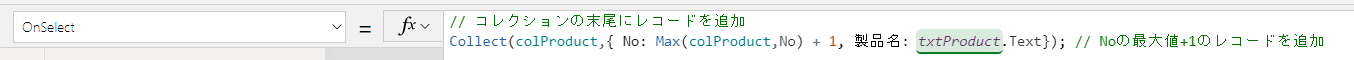 Collect(colProduct,{ No: Max(colProduct,No) + 1, 製品名: txtProduct.Text}); // Noの最大値+1のレコードを追加