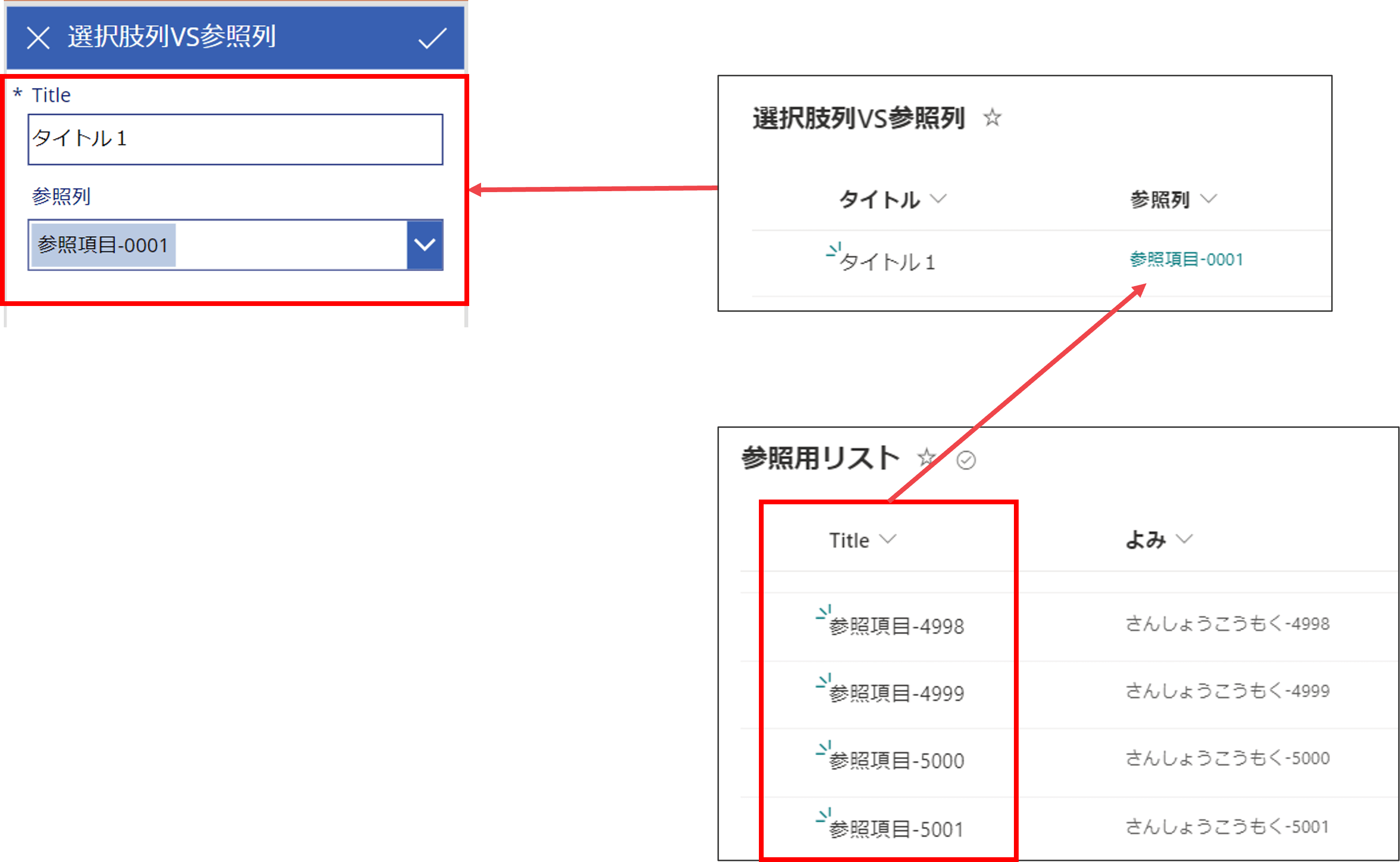 参照列 × 参照用リストを直接指定-検索項目 ※下記の例は、参照用リストの Title 列とよみ列をそれぞれで検索しています。
